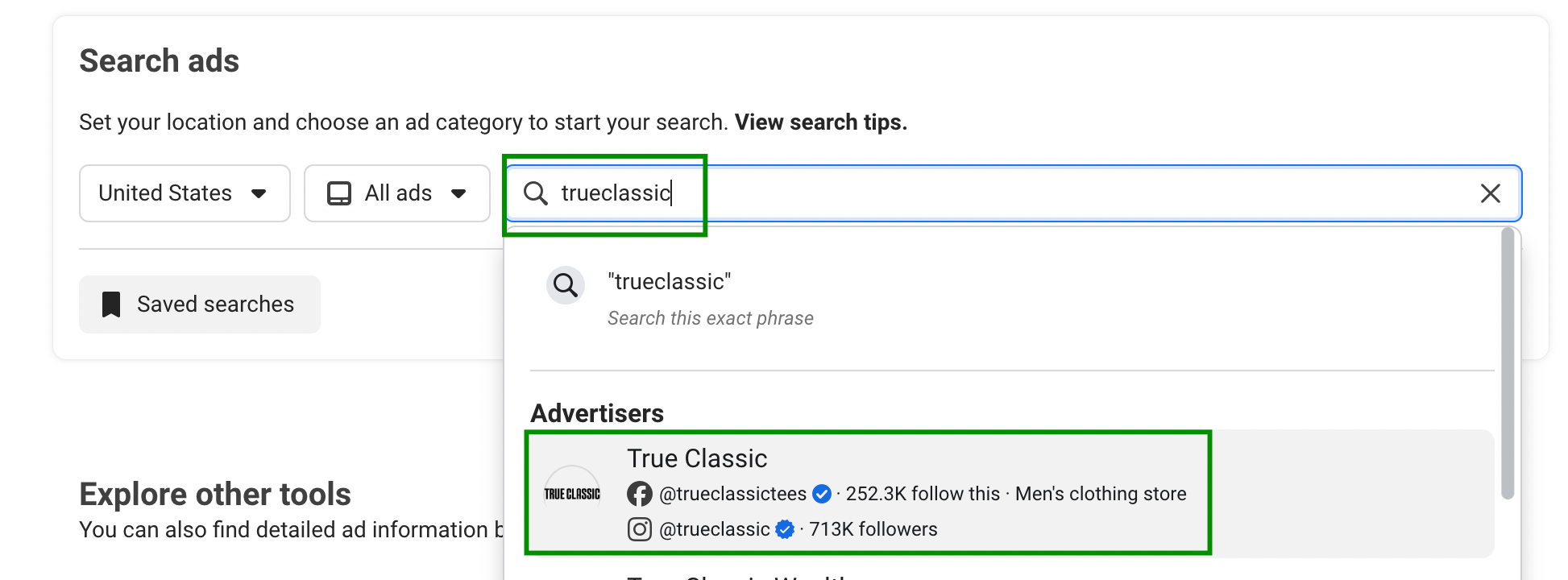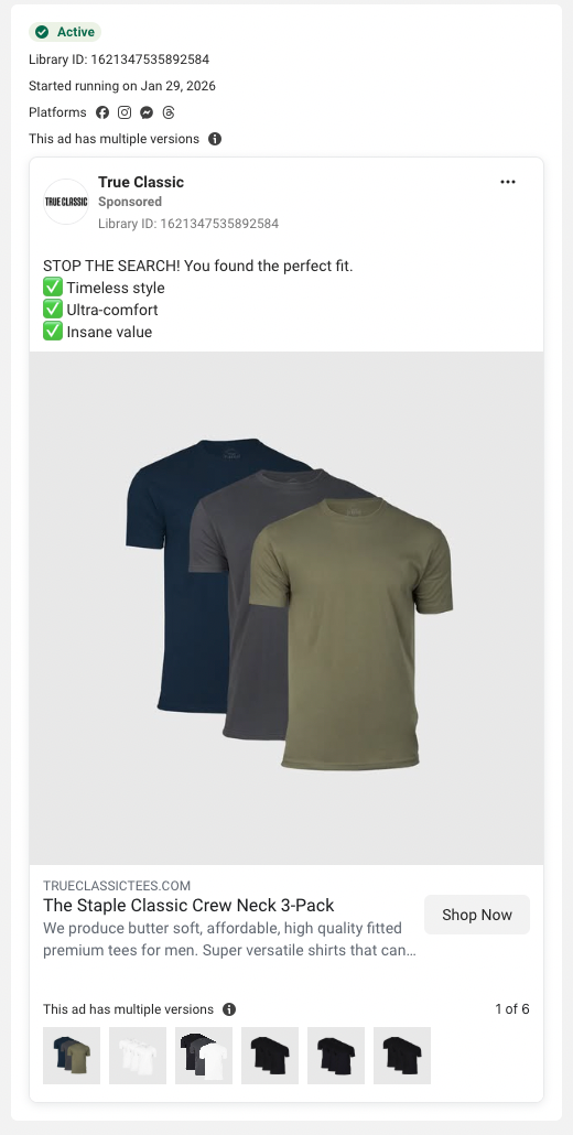 Ví dụ chúng ta thử tìm True Classic và mở trang Facebook chính thức của họ để xem họ đang chạy những quảng cáo nào.